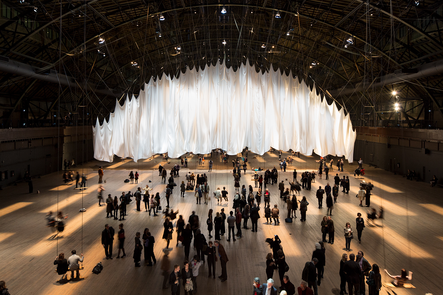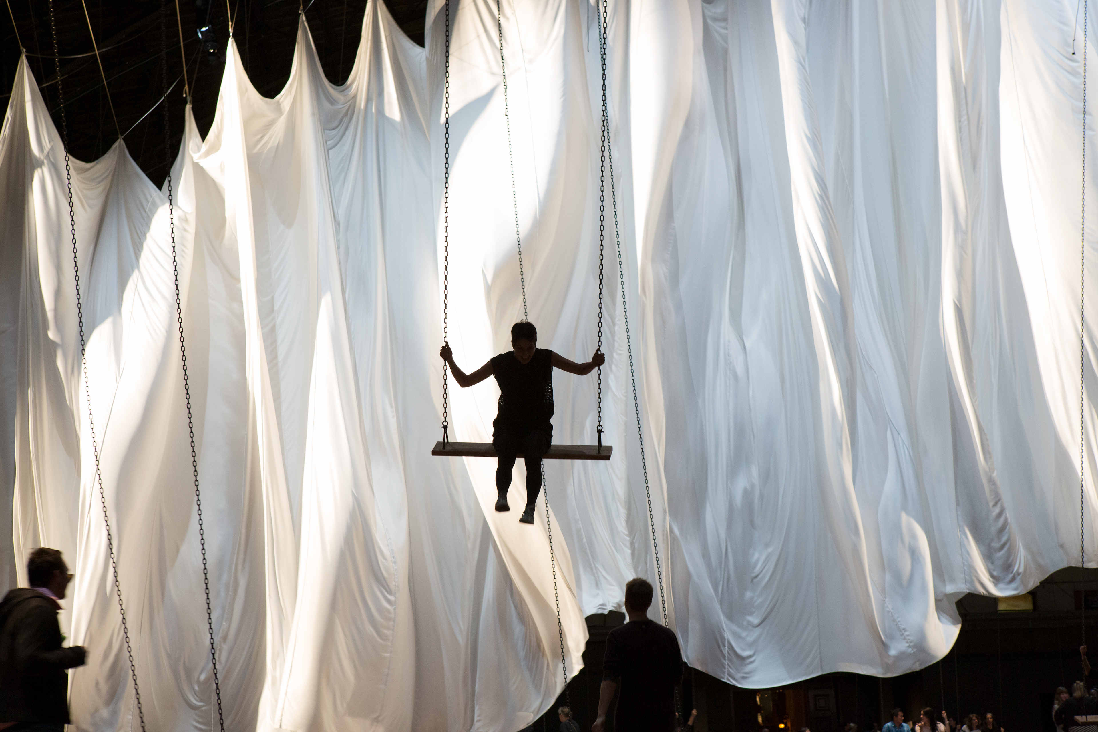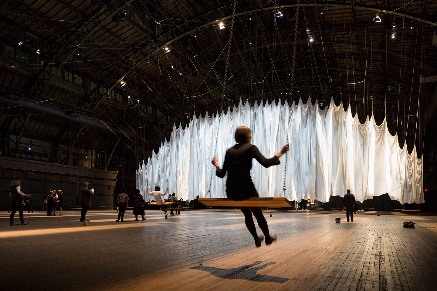 Visual artist Ann Hamilton combines the ephemeral presence of time with the material tactility for which she is best known to create a new large-scale installation for the Wade Thompson Drill Hall. Commissioned by the Armory, the event of a thread references the building’s architecture, as well as the individual encounters and congregational gatherings that have animated its rich social history. A multisensory affair, the work draws together readings, sound, and live events within a field of swings that together invite visitors to connect to the action of each other and the work itself, illuminating the experience of the singular and collective body, the relationship between the animal and the human. The address of the readers to the pigeons shifts at the end of each day, when a vocalist on the drill hall’s balcony serenades their release to flight. Each day’s song is cut with a record lathe, and the resulting recording is played back the next day.